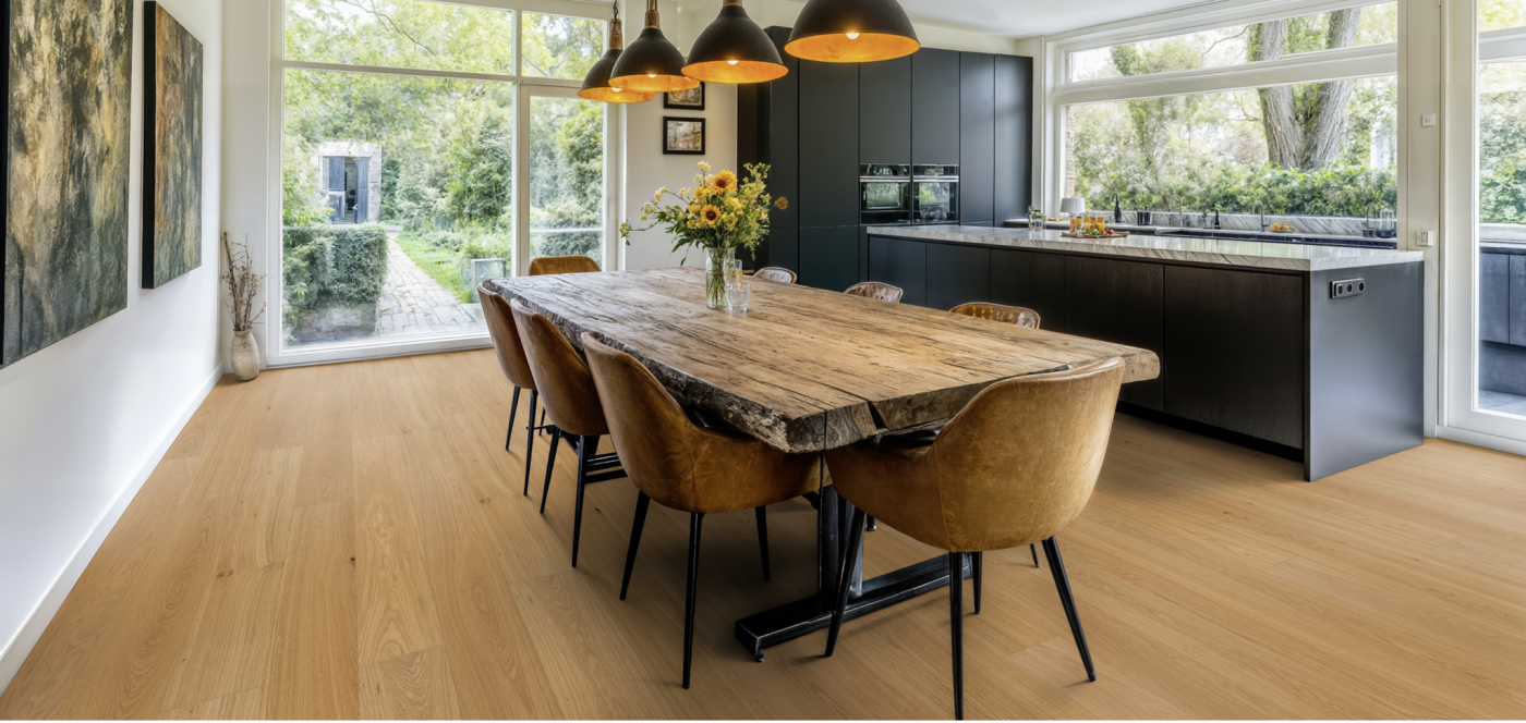 Sàn gỗ Artureon có nhiều lựa chọn kích thước và kiểu vân. Điều này giúp dễ dàng tạo sự liên kết giữa các khu vực. Không gian mở như phòng khách – bếp thường yêu cầu sự liền mạch cao.